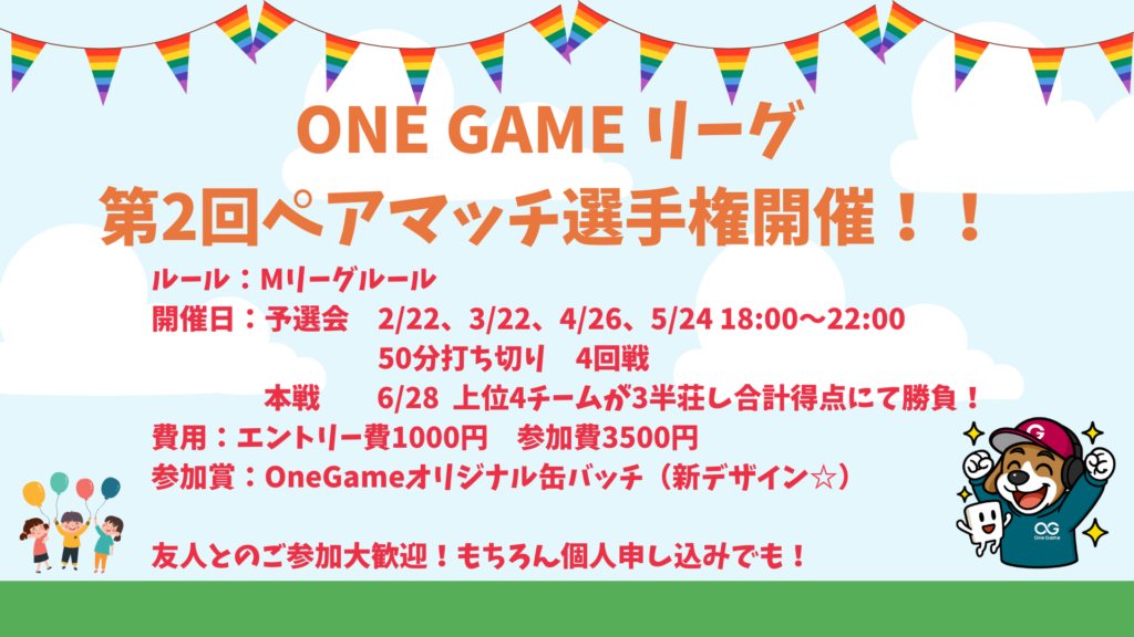 備考欄にペアを組む人が決まっていればお書きください☆ ペアが決まっている方はペア名も合わせてお知らせください ペア決まっている場合、一人で2枠予約していただいても大丈夫です☆ 【日程】 ・予選会:2/22.3/22.4/26.5/24 ・本戦:6/28 【時間】 ・18:00-22:00 【ルール】 Mリーグルール 50分打ち切り4半荘 チョンボ等は優しい大会のルールになります 【講義料金】 エントリー費1000円 各部3500円 ※1ペア予選4日程合計で15,000円(7500円/人) 決勝戦費:3,000円 【募集人数】 12ペア24名 【参加賞】 ・OneGameオリジナル缶バッチ(第2弾) 【優勝ペア】 ・OneGameオリジナルトートバック 【レギュレーション】 ・4日程のうちペアの方どちらかが参加して下さい ※1日程にペア2人で参加し4半荘をペアで2半荘ずつ打つ 1日程1人ずつ参加するなどペアによって調整可能です 【決勝戦】 ・上位4チームの直接対決(ポイントも持ち越し無し) ※ペア両方参加してください🐶 ・Mリーグルール3半荘 ◆撮影卓を使う予定です◆ 当日の撮影卓での対局は生配信されます☆ 動画はもちろんプレゼント ・初心者の方、麻雀に慣れたい方、大会慣れしたい方大歓迎!! ・ラインオフィシャルからの予約OK‼ <勉強会>レベル☆~レベル☆☆☆ ※非常に残念ながら18歳未満・高校生の方はご利用できません